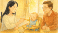 空港の出発ロビーで、パートナーが1歳の赤ちゃんを抱きながら全盲の母と笑顔で立っている水彩イラスト 妊娠・出産体験記
